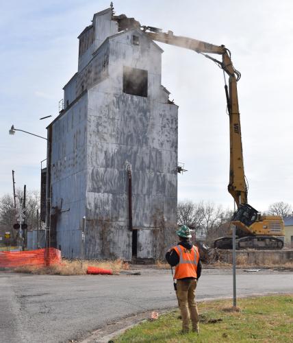 Last week the Burlington Northern- Santa Fe Railroad Co. (BNSF) took down the old grain elevator and storage bins at Prescott, taking with it a large piece of history that touched several families in the community. Originally, it was built by members of the Norbury family, then it was sold and was owned and operated by the Epps family for many years, taking care of grain sales and shipping for local farmers. During those years, it touched the lives of the Johnson family, the Walrod family and many more.