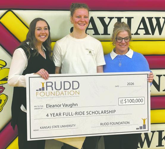 Jayhawk Linn High School senior Eleanor Vaughn, daughter of Lucas and Megan Vaughn, was honored in a surprise ceremony attended by students, staff and her family as the recipient of the highly competitive Rudd Foundation Scholarship.